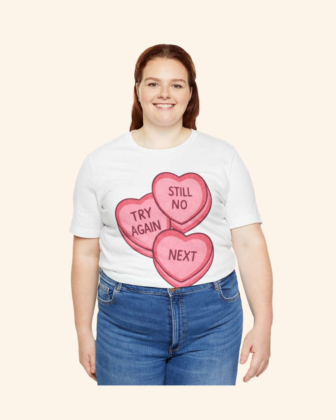 Some messages do not need explaining. The Still No, Next T-Shirt says exactly what it means, wrapped in a candy heart graphic that feels playful, direct, and very intentional. This graphic tee is for women who have been there, learned the lesson, and moved on with style. It works for Valentine’s Day, breakups, fresh starts, or any day you want your outfit to do the talking.